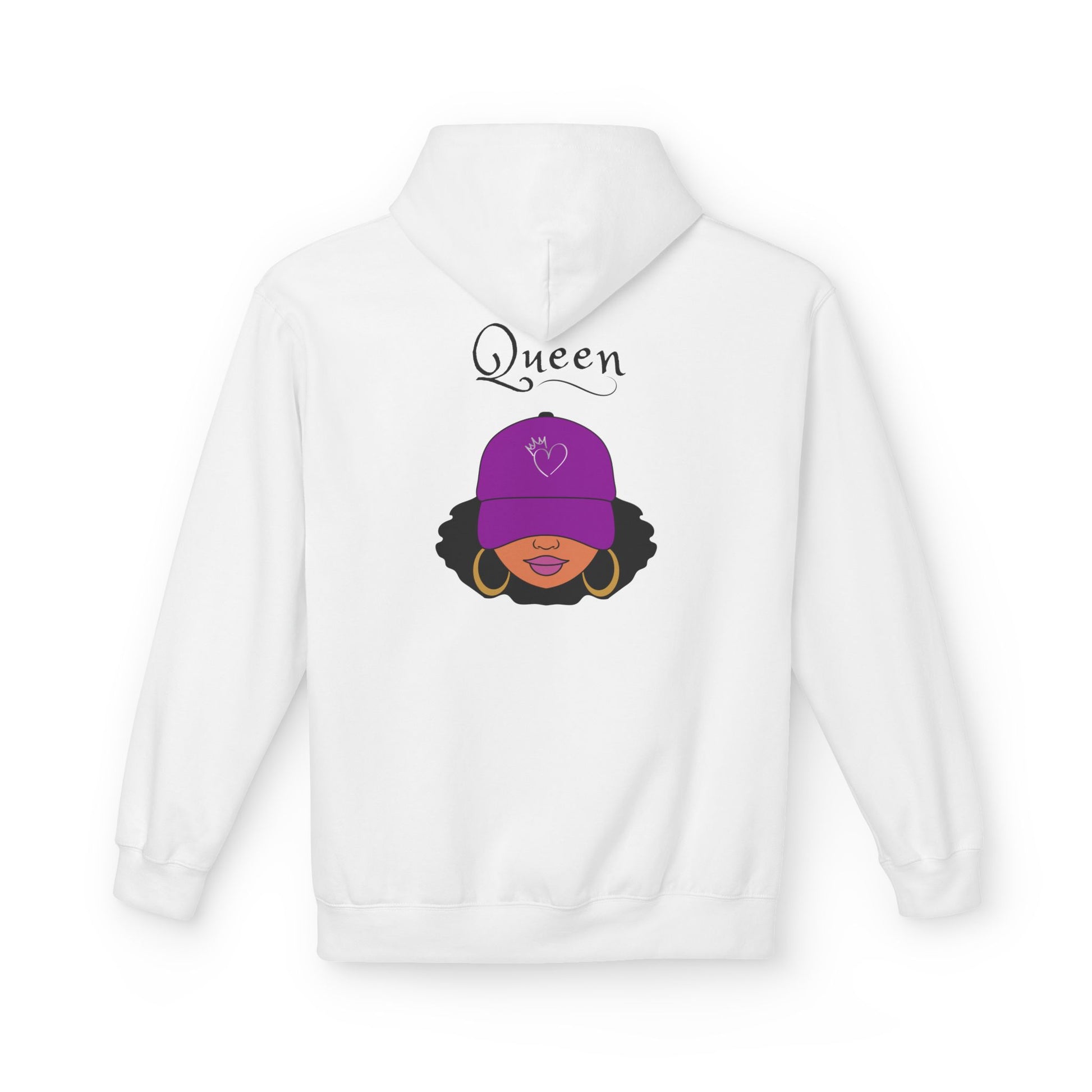 A relaxed, midweight hoodie designed for everyday confidence. The soft fleece interior and dropped shoulders create a cozy silhouette that layers easily over tees or loungewear. A subtle chest emblem keeps the front understated, while the back features a bold illustrated queen wearing a purple cap — a calm, stylish statement for anyone who embraces quiet strength. Thoughtfully made with sustainable and socially conscious practices, this hoodie combines comfort, durability, and personality for days when you want to feel both seen and comfortable.